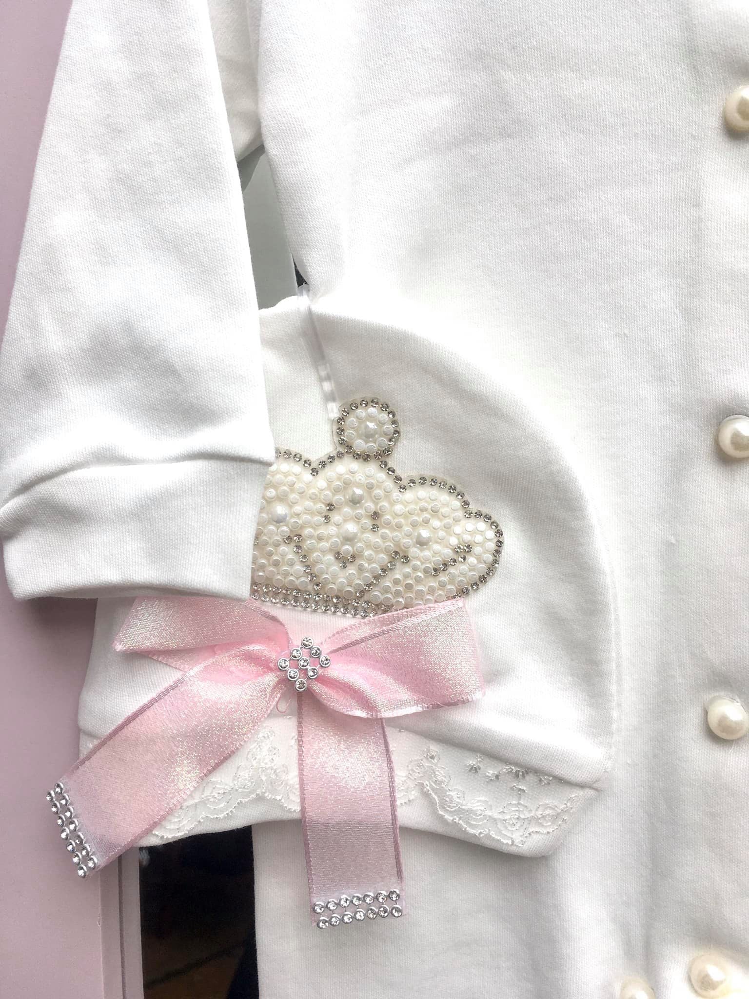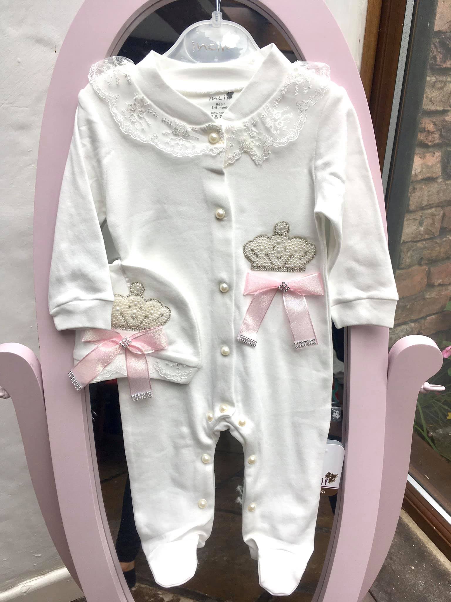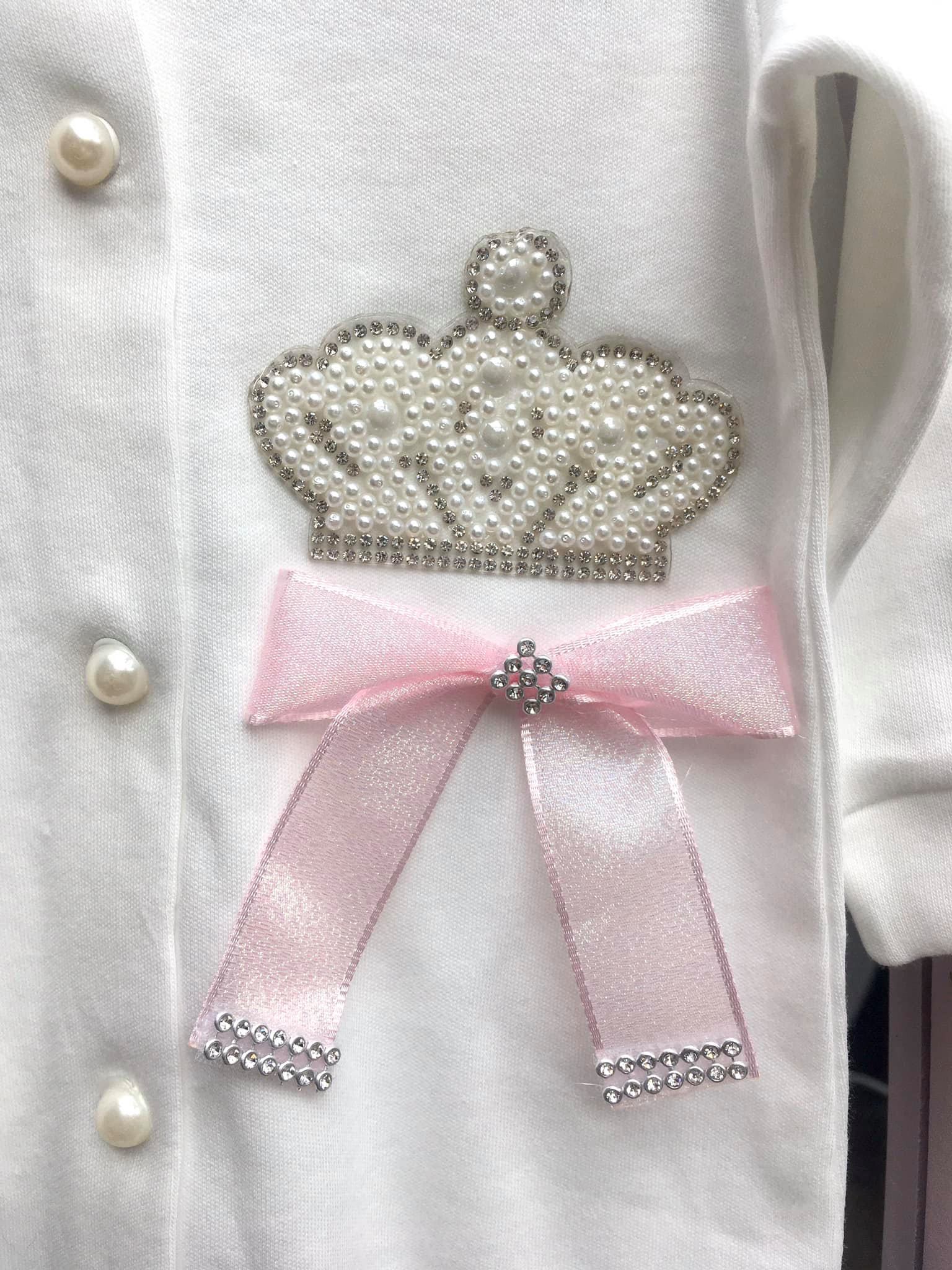Stunning baby grown with diamante and pearl detail, with matching hat and mittens.