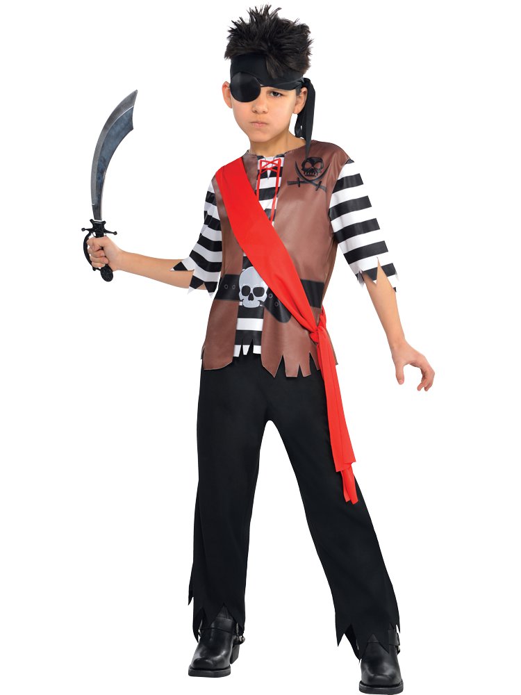 This four-piece Pirate outfit includes a printed top, a pair of tattered black trousers, a red self-tie sash and a black self-tie bandana, just add a cutlass and an eyepatch to complete the look!
